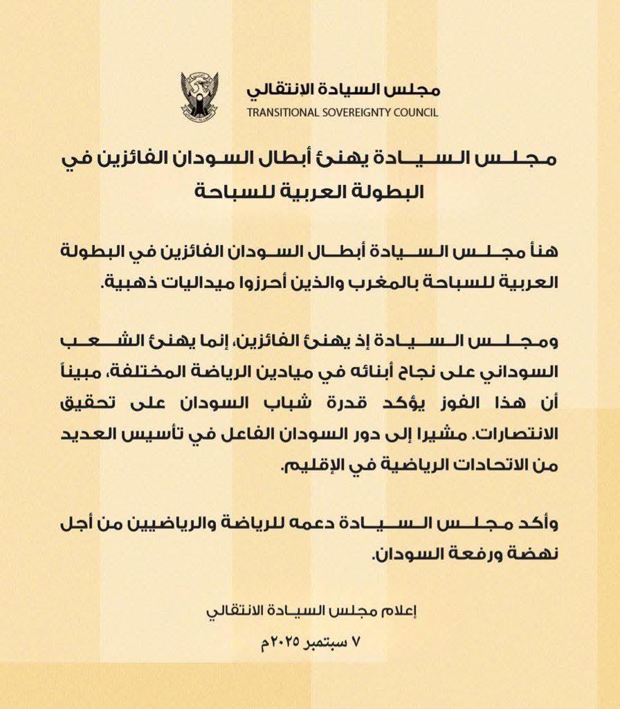 أعرب مجلس السيادة الانتقالي عن فخره واعتزازه بالإنجاز الذي حققه أبطال السودان في منافسات البطولة العربية للسباحة بالمغرب، بعد أن تمكنوا من حصد ميداليات ذهبية رفعت اسم السودان عاليًا في المحافل الرياضية.