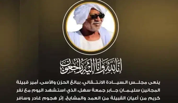 متابعات – أمواج نيوز – نعى مجلس السيادة الانتقالي الأمير سليمان جابر جمعة سهل، أمير قبيلة المجانين، الذي استشهد اليوم مع عدد من أعيان القبيلة إثر هجوم غادر شنته مليشيا آل دقلو أثناء اجتماع صلح عقدته الإدارة الأهلية بمنطقة المزروب في شمال كردفان.
