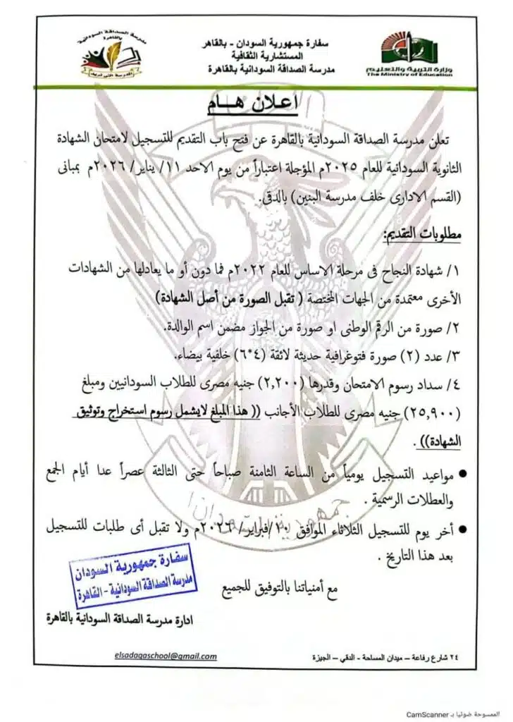 متابعات – أمواج نيوز – أعلنت مدرسة الصداقة السودانية بالقاهرة، التابعة للمستشارية الثقافية بسفارة السودان، عن فتح باب التسجيل لامتحانات الشهادة الثانوية السودانية للعام 2025 المؤجلة، اعتباراً من يوم الأحد 11 يناير 2026 بمباني القسم الإداري خلف مدرسة البنين بالدقي.
